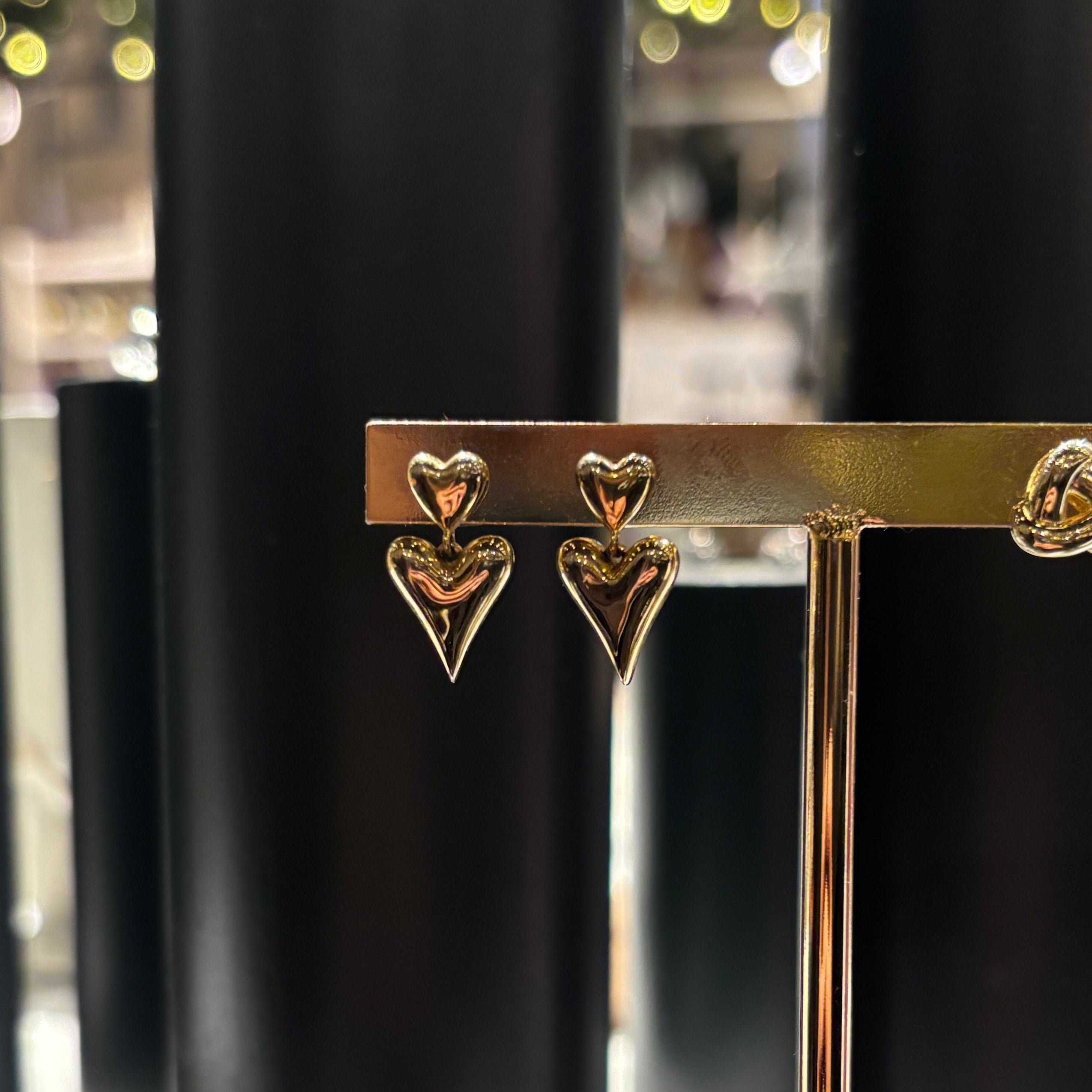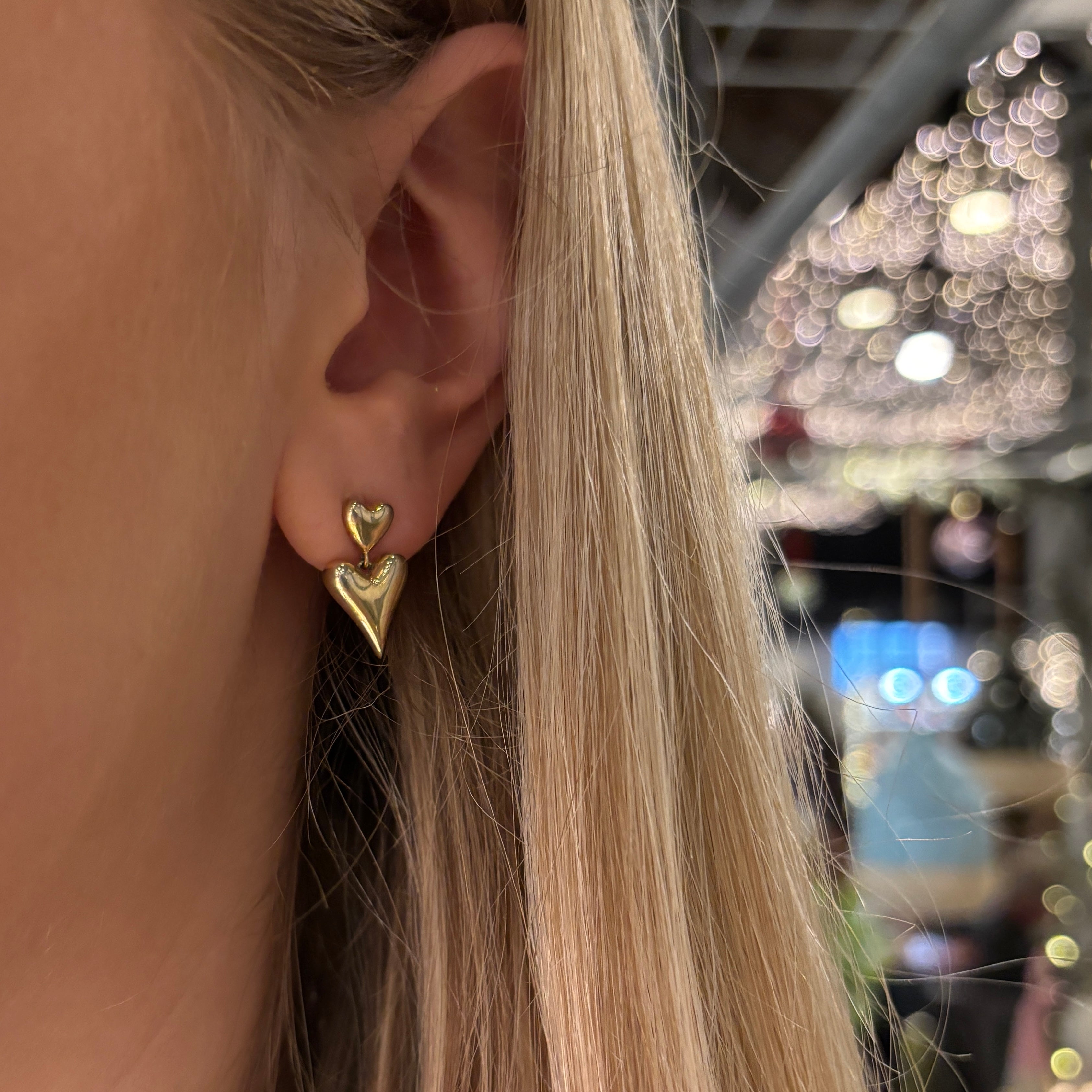 Elegante dobbelt-hjerte øreringe med et blødt, organisk udtryk. Det øverste hjerte sidder som en fin detalje ved øreflippen, mens det større hjerte nedenunder skaber et let og feminint fald. Perfekte både til hverdag og fest.